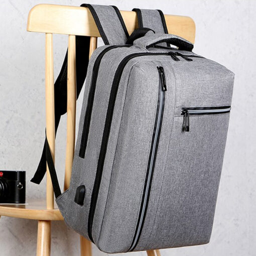 This fashionable business/school backpack is manufactured from quality 300D Oxford fabric with 200D polyester inside lining. Features independent 2 compartments, the back compartment has a large pouch with a velcro closure strap for laptop and iPad. This pouch is padded thicker to protect inside laptop and/or iPad. The front compartment is a large side zipped opening pouch, on top of this front compartment, it has a front zipped pouch, a zipped net pouch on the bottom, a small pouches and 2 pen holders. On the back of this compartment, it has elastic straps and clip to hold the contents. It also features USB charging port with a charging cord attached, and adjustable straps. The cross strap on the back is to hold the bag onto luggage handle. On the front of bag, it has fashionable designed 2 zipped large pouches.