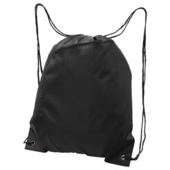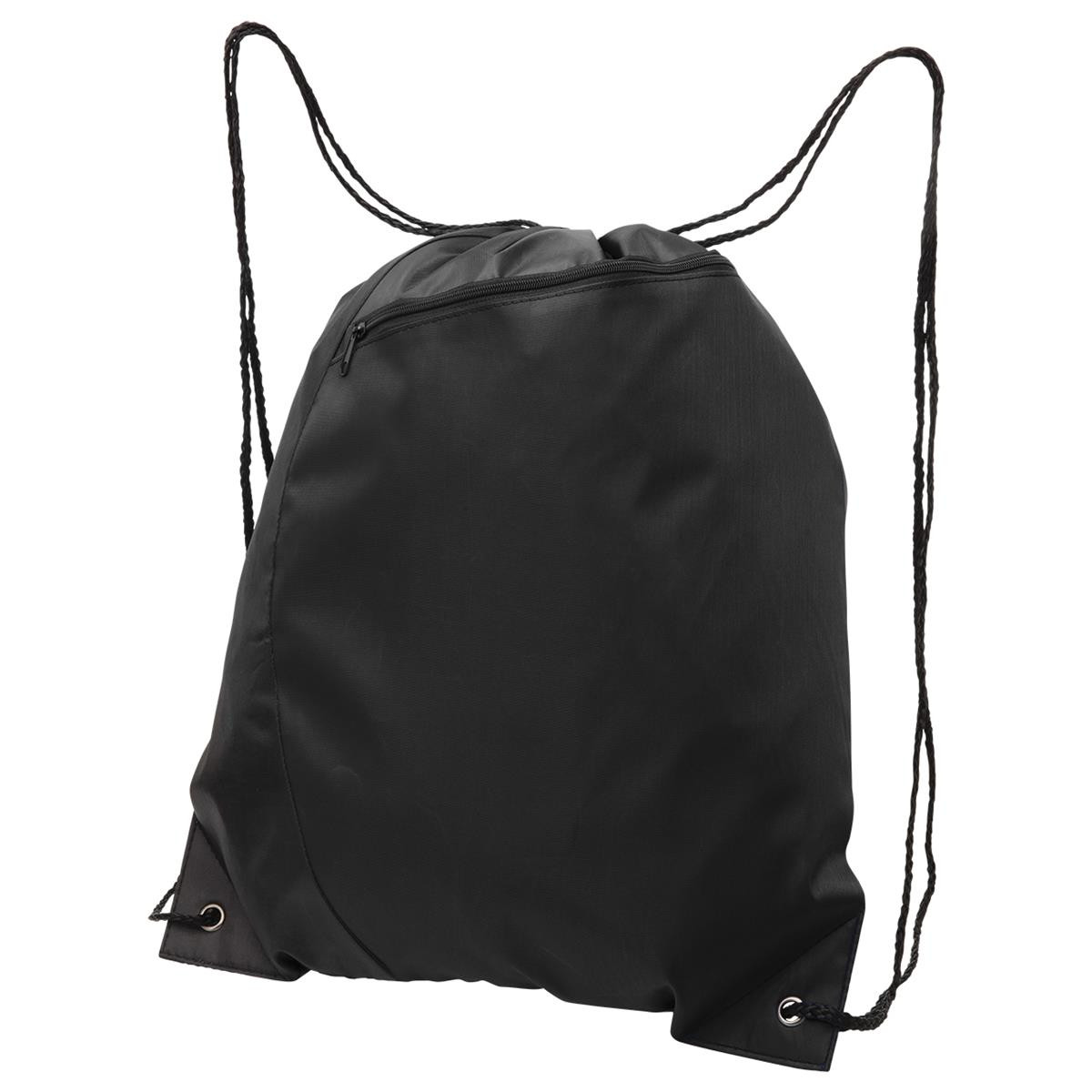 210D polyester|Drawstring closure|Stylish curved 2-panel front|Draw cords for use as over shoulder or backpack style carrying|Front zippered storage pocket|Reinforced eyelets at base|Black back panel