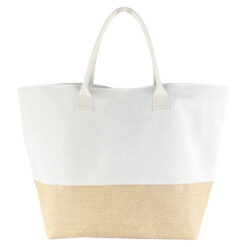 Fashion inspired elegant and smart eco-friendly Summer Jute Bag has soft padded cotton webbing handles for added comfort and a delightful combination of natural jute and cotton-like polyester. With a wide bottom gusset it creates a large capacity shopper. It has a magnetic top button closure and inside polyester liner with a small pouch for storing your receipts coins wallets and so much more. 40L capacity.