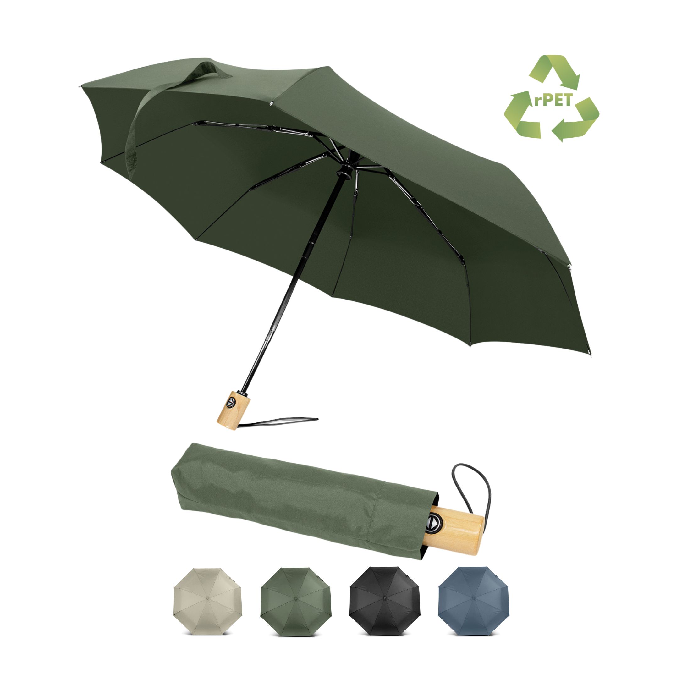 Eco-conscious 54cm, triple-folding umbrella with an eight rib frame and automatic opening and closing. The eight-panel canopy is manufactured from 190T rPET (recycled PET) pongee which is produced by recycling used water bottles and food packaging. The shaft and frame are constructed from fibreglass to ensure the umbrella is strong and windproof. It folds down to a very compact 28cm when not in use and has a matching carry sleeve. Other features include a Velcro tie, a natural Japanese Oak wooden handle and a matching woven elastic wrist strap.
